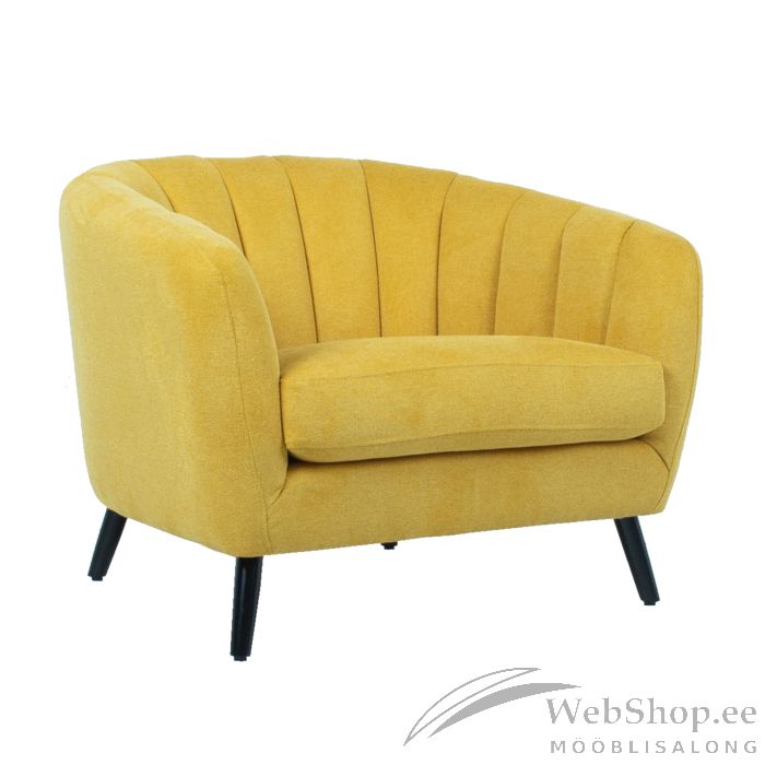 Tugitool MELODY kollane. Tugitool on kaetud 100% polüesterkangaga. Karkass on valmistatud puidust ja vineerist. Tugitoolil on pocket vedrustus. Polsterdus: polüuretaanvaht. Tugitooli jalad on valmistatud puidust. Istme kõrgus on 46cm, istme sügavus 57cm, istme laius 67cm eest äärest ja 52cm tagant. Toote mõõdud on 100x88xH76cm.