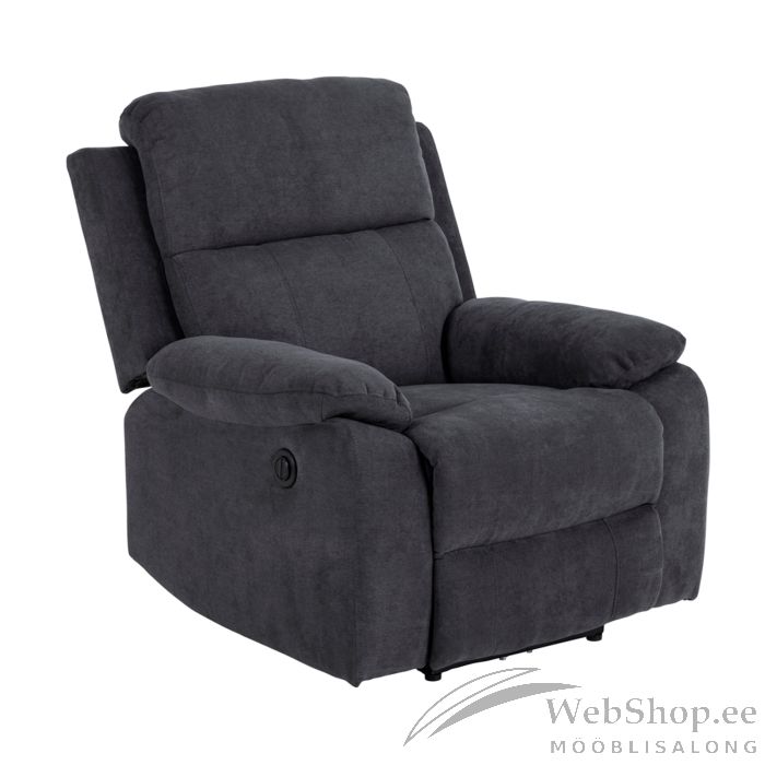 Tugitool elektriline recliner MORA, 89.5x95xH98cm. Kangas: tumehall- Enjoy fabric dark grey 24, 100% polüester, Martindale: > 25000. Jalaraam: must metall. Istme kõrgus 49cm. Recliner istumisosa on sujuva elektrilise seljatoekalde reguleerimisega.