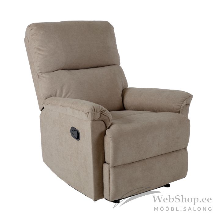 Recliner tüüpi tugitooli selja- ja jalatoe asendit on võimalik muuta manuaalse mehhanismi abil. Jalatuge üles tõstes liigub seljatugi sujuvalt kaasa lamavasse asendisse. Kattematerjal: 100% polüesterkangas. Karkass: puit, metall. Polsterdus: polüuretaanvaht 24kg/m³.