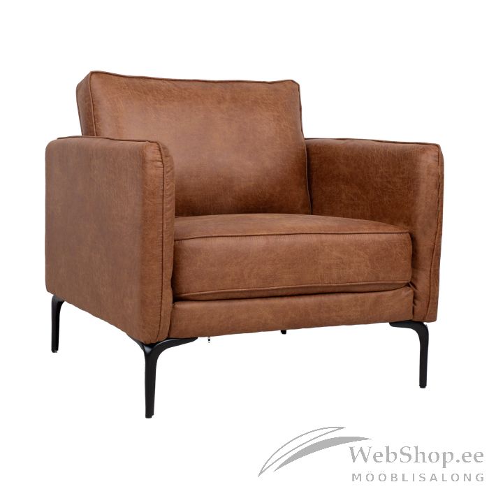 Tugitool SOFIA pruun. SOFIA pehme mööbli sari ühendab endas parimal viisil ajatu, elegantse disaini ja kaasaegse tehnoloogia. Tugitooli karkass on valmistatud galvaniseeritud terasest. Metallkarkassiga pehme mööbel on oluliselt vastupidavam ja kergem kui traditsioonilisel viisil valmistatud puitkarkassiga pehme mööbel. Tugitooli metallraami välisküljed on kaetud porolooni kihiga. Istmepõhjale annavad vajaliku toe ja elastsuse kvaliteetsed suure tõmbetugevusega 9G sik-sak vedrud. Istmepadja mugavuse ja ilusa vormi tagab kolmekihiline polsterdus. Alumine ja kõige paksem kiht on kõrge tihedusega polüretaanvaht, selle peal on pehme poroloonikiht, mis on kaetud polüesterkiu kihiga. Lahtine seljatoepadi on täidetud mahulise polüesterkiuga. Kogu tugitool on kaetud kunstnahka meenutava polüesterkangaga. Tugitooli üldmõõdud on 80x83xH82cm. Istme laius 62cm, istme sügavus 52cm, istme kõrgus 44cm. Käetoe kõrgus maast 63cm. Tugitoolil on mustad metallist jalad H18cm.