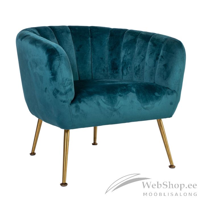 Tugitool TUCKER mereroheline. Tugitool on kaetud mererohelise sametkangaga. Kattematerjal on 100% polüesterkangas. Tugitoolil on kuldsed roostevabast terasest jalad. Toote mõõdud on 78x71xH69cm.