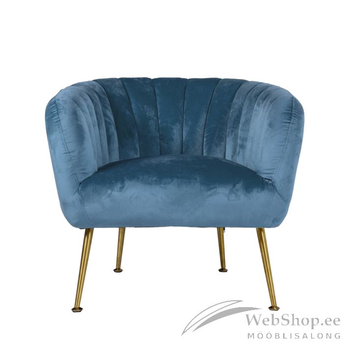 Tugitool TUCKER meresinine. Tugitool on kaetud meresinise sametkangaga. Kattematerjal on 100% polüesterkangas. Tugitoolil on kuldsed roostevabast terasest jalad. Toote mõõdud on 78x71xH69cm.