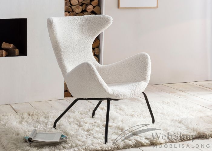 Valget värvi tekstiilist tugitool. Tooli jalad on mustast metallist. Tooli raam on puidust. Pehmenduseks poroloon.