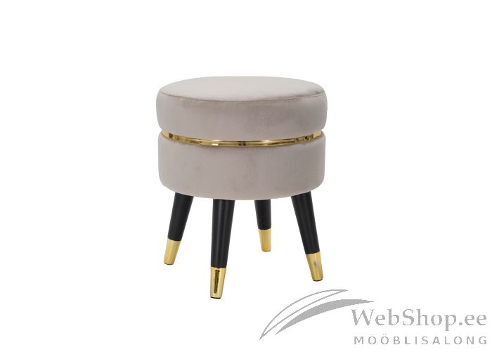 Stiilne halli värvi tekstiilist kattega tumba. Jalad on kuldse ja musta tooni metallist. Istme pehmenduseks on kasutatud poroloon.