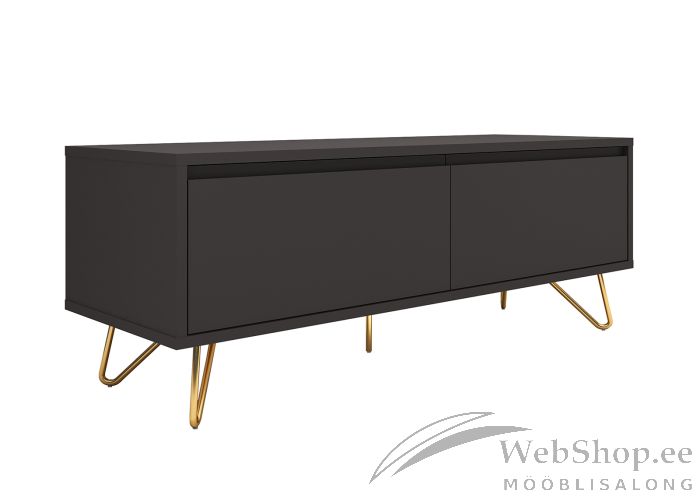 MDF-mööbliplaadist valmistatud tv-alus. Viimistlus: matt tumehall. Jalad on kulla tooni metallist. 1 metallist siinidel sahtel, 1 uks. Ukse taga üks riiul, mida on võimalik eemaldada.