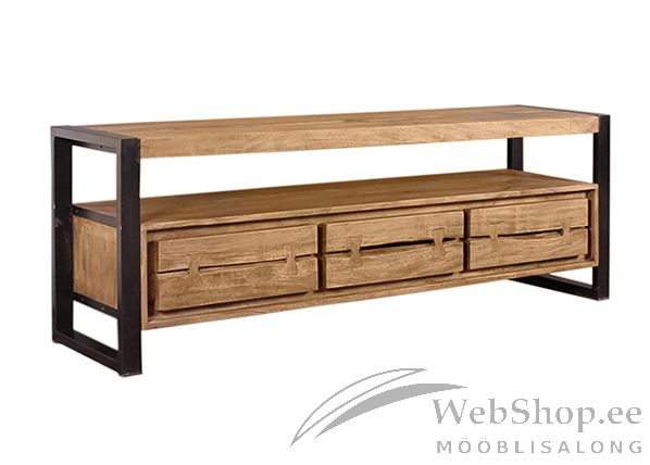 Naturaalsest akaatsiapuidust tv-alus. ääred mustast metallist. Viimistlus: konjak. 3 sahtlit. Sahtlid liiguvad avas siinideta. Iga toode on originaalne, ehk võib erineda pildil olevast kuna on naturaalsest puidust. Tarnitakse monteeritult.