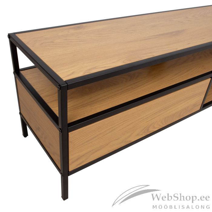 TV laud HEDVIG 120x33xH40cm, saar/must. Lauaplaat, riiulid ja sahtel: saare dekooriga melamiinplaat. Laua jalad ja raam on valmistatud metallist ja viimistletud musta pulbervärviga.
