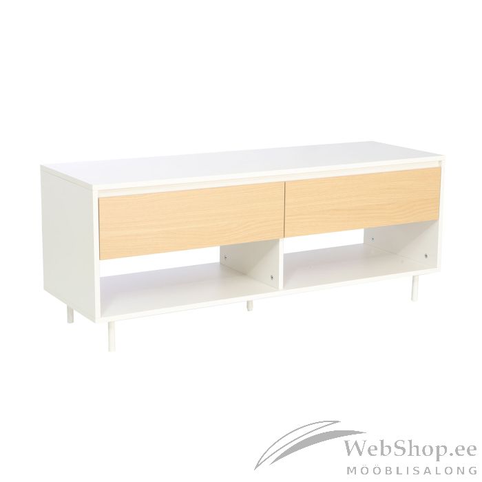 TV laud HERTA 2-sahtliga 120x40xH48cm, valge/hele puit. Materjal: melamiinplaat. Värvus: hele puit/valge. Laua jalad on valmistatud metallist ja viimistletud valge pulbervärviga.