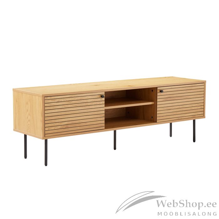 TV laud LINE 2-ukse ja riiulitega 150x40xH50cm. TV laud on valmistatud tammedekooriga melamiinplaadist. Efektsed reljeefse pinnaga triibulised uksed on valmistatud mustast MDF plaadist, mida kaunistavad tammevärvi kitsad liistud. TV laua metallist jalad on viimistletud musta pulbervärviga.