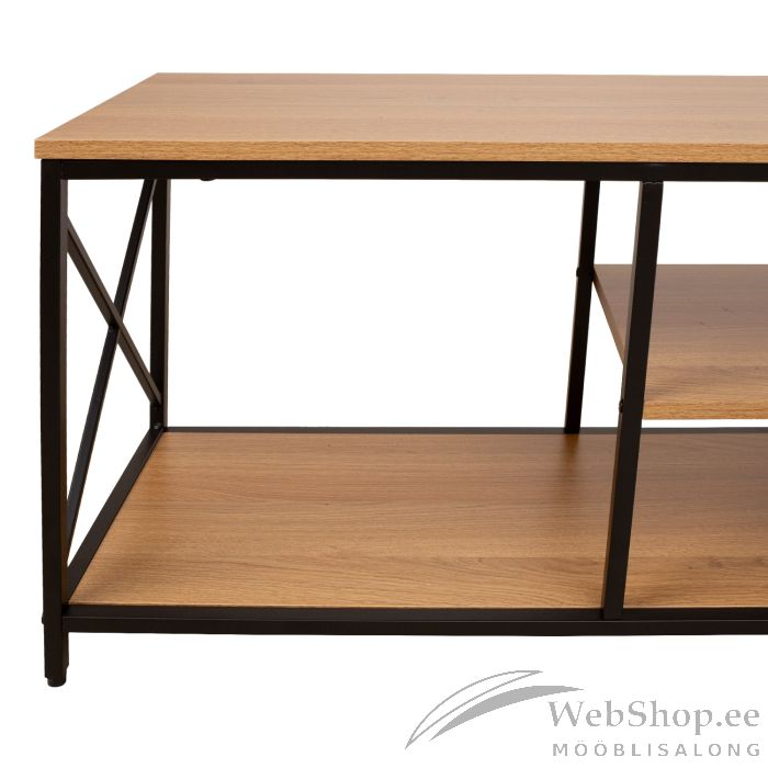 TV laud STUDY 140x40xH46,5cm, tamm/must. Pealmine plaat ja riiulid: tamme dekooriga melamiinplaat. Raam on valmistatud metallist ja viimistletud musta pulbervärviga.