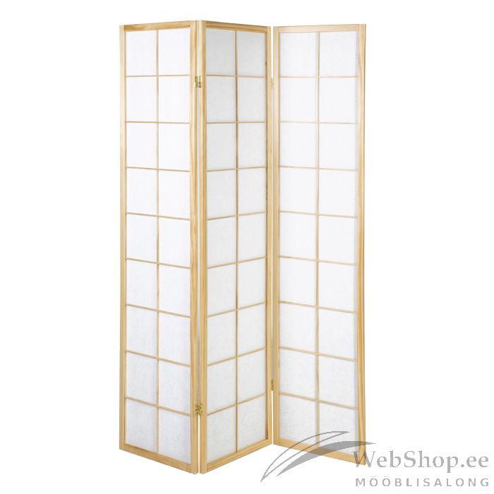 Vahesein ORIENTAL 3-paneeliga 130,5x2xH178,5cm, hele männipuidust raam. Raami sees on valge läbikumav paberisarnane laustekstiil.