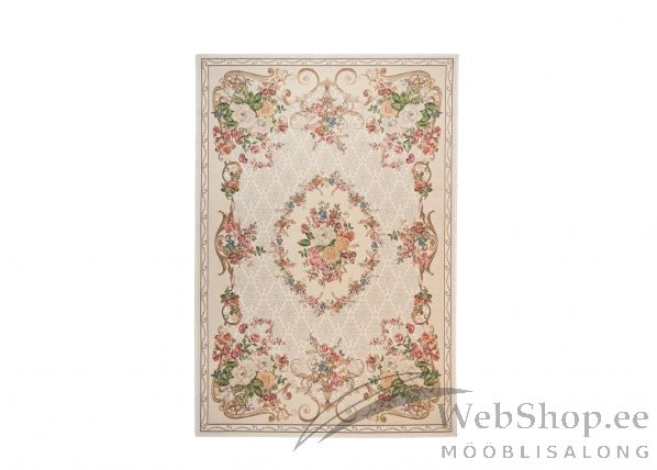 Masinkootud lillemotiiviga vaip. Materjal: 63% polüester, 27% polüpropüleenkiud, 10% puuvillakiud. Sobib põrandaküttega põrandale. Toodetud Belgias.