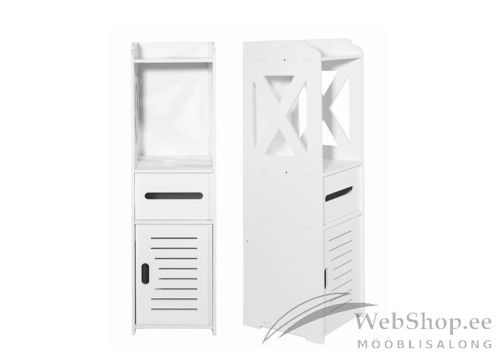 Kitsas mööbliplaadist valmistatud vannitoakapp. Kapil on avatud riiulid, uksega panipaik ning wc-paberi hoidja. Ideaalne väikestesse vannitubadesse. Värvus: valge.