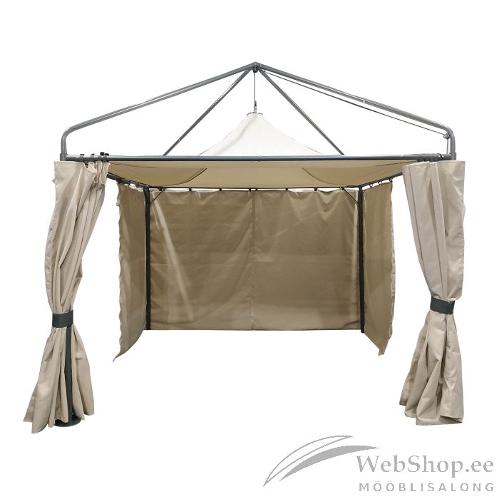 Varikatus MADRID 3x3m beež. Varikatus loob meeldiva varjualuse lõõgastumiseks. See pakub leevendust kuuma päikese eest ja ka kergemate tuulepuhangute korral. Katus on valmistatud polüuretaankattega beežist polüesterkangast 250g/m² ning küljekardinad on polüesterkangast 160g/m². Toote hall terasraam on pulbervärvitud. Terasest tugipostide mõõdud on D57x1,3mm, kaldtalade mõõdud D38x1,2mm ja ripptala 30x15mm. HOIATUS: varikatus tuleb kasutamisel fikseerida aluspinnale. Toode ei ole mõeldud kasutamiseks tugeva tuule ja vihma korral.