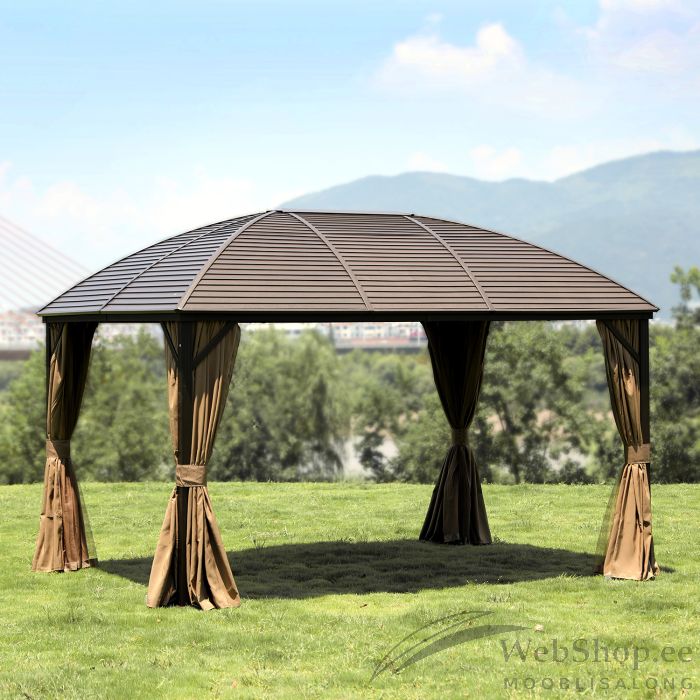 Varikatus SUNSET 3x4xH2/2,7m, pruun/beež. Elegantne ja funktsionaalne varikatus/aiapaviljon pakub kaitset ja varju nii kerge vihma, kui kõrvetava päikese eest ning võimaldab nautida õues olemist ilmast ja kellaajast olenemata. Varikatuse kõigil külgedel on beežid polüesterkangast (180g/m²) kardinad ja lukuga suletavad nailonist sääsevõrgud. Varikatuse põhikonstruktsioon on valmistatud alumiiniumist. Kõik raami osad on viimistletud pruuni pulbervärviga. Küljepostide mõõdud on 76x76mm, risttala mõõdud 107x46mm, katuseribid 52x40x1mm, 44x31x1mm. Galvaniseeritud metallkatuse paksus on 4mm. HOIATUS: ekstreemsete ilmastikutingimuste või tormihoiatuse korral ei tohi jätta varikatust järelevalveta. Tugev tuul, vihm või lumi võivad varikatus kahjustada. HOIUSTAMINE: varikatuse eluea pikendamiseks soovitame see suvehooaja lõppedes lahti monteerida ja hoiustada jahedas, kuivas ning hea ventilatsiooniga ruumis. Juhul kui varikatus jääb talveks üles tuleb jälgida, et katusele ei koguneks liigselt lund. Eemaldage kogunenud lumi esimesel võimalusel. Suvehooaja lõppedes eemaldage sääsevõrgud ja kardinad. Puhastage ja kuivatage kardinad enne hoiule panekut.