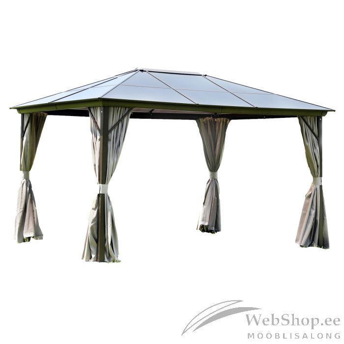 Varikatus SUNSET 3x4xH2/2,7m, pruun/taupe. Elegantne ja funktsionaalne varikatus/aiapaviljon pakub kaitset ja varju nii kerge vihma, kui kõrvetava päikese eest ning võimaldab nautida õues olemist ilmast ja kellaajast olenemata. Varikatuse kõigil külgedel on polüesterkangast (180g/m²) kardinad ja lukuga suletavad nailonist sääsevõrgud. Varikatuse põhikonstruktsioon on valmistatud alumiiniumist. Kõik raami osad on viimistletud pruuni pulbervärviga. Küljepostide mõõdud on 76x76mm, risttala mõõdud 116x76mm, katuseribid 29x26mm. Katusepaneelid: 6mm polükarbonaat ehk kihtplastik. Polükarbonaat on ilmastikukindel, keskkonnasõbralik materjal, mis pakub ainulaadset kombinatsiooni vastupidavusest koos väga hea löögitugevusega. Samuti on materjalil hea valguse läbilaskvus ja kõrge temperatuuritaluvus. HOIATUS: ekstreemsete ilmastikutingimuste või tormihoiatuse korral ei tohi jätta varikatust järelevalveta. Tugev tuul, vihm või lumi võivad varikatus kahjustada. HOIUSTAMINE: varikatuse eluea pikendamiseks soovitame see suvehooaja lõppedes lahti monteerida ja hoiustada jahedas, kuivas ning hea ventilatsiooniga ruumis. Juhul kui varikatus jääb talveks üles tuleb jälgida, et katusele ei koguneks liigselt lund. Eemaldage kogunenud lumi esimesel võimalusel. Suvehooaja lõppedes eemaldage sääsevõrgud ja kardinad. Puhastage ja kuivatage kardinad enne hoiule panekut.