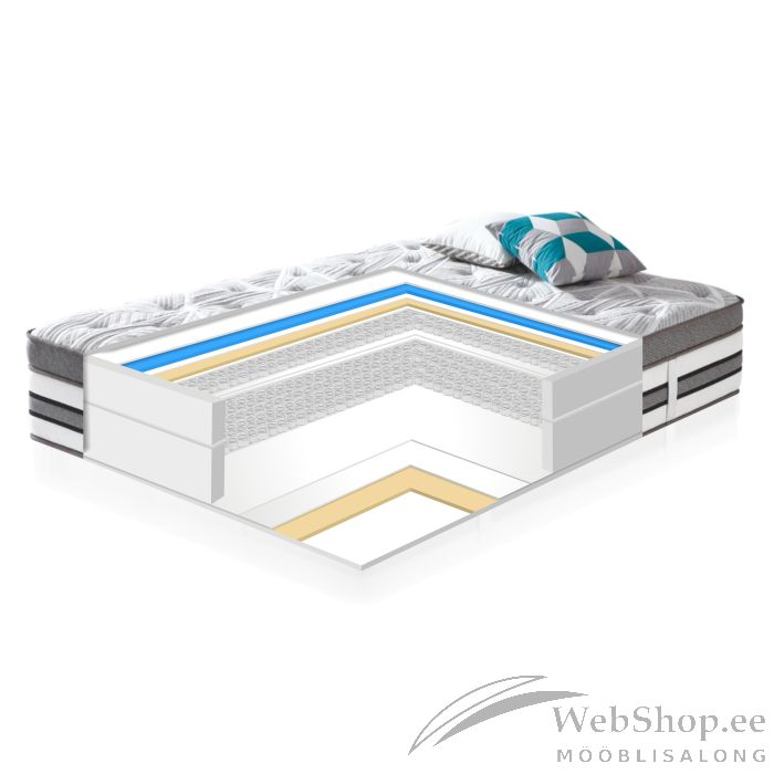 Vedrumadrats HARMONY DOUBLE DELUX 160x200cm. PERFECT SLEEP BY HOME4YOU. Luksuslik keskmise jäikusega vedrumadrats on kõrgusega 38cm. Ülima mugavuse tagab kahekordne deluxe-pocket vedruplokk, mille ülemine kiht on 3-tsooniline ja alumine kiht 7-tsoonilne pakitud vedrusüsteem. Sellisel puhul on erinevate jäikustega vedrud paigutatud vastavalt inimkeha vajadusi järgides eri tsoonidesse. Õla- ja puusapiirkonda toetavad tugevamad vedrud, et vältida liigset vajumist madratsisse. Hele stretch-kangast madratsikate on nahasõbralikust ja pehmest puuvilla-polüestrist (kangakaal 480g/m2). Madratsi pealmise villakihi all on uudne jahutav mälu-poroloon (cool gel memory foam), milles sisalduvad geelkuulikesed aitavad reguleerida nii magamistemperatuuri kui ka niiskussisaldust. Lisaks on madratsis veel kaks erinevat kvaliteetset poroloonikihti, mis tagavad nii lihaste kui luustiku maksimaalse lõdvestuse. Kangas, vilt ja vatiin vastavad rahvusvahelisele Öko-Tex 100 standardile. Eemaldage ettevaatlikult kilepakend ja asetage madrats voodi peale. Toote mõõdud on 160x200xH38cm.
