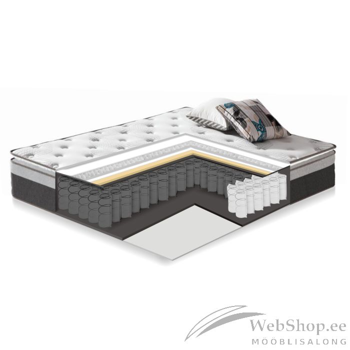 Vedrumadrats HARMONY TOP POCKET 180x200cm. PERFECT SLEEP BY HOME4YOU. Keskmise jäikusega madratsil on pakitud deluxe-pocket vedrustus (1,9mm/äärtes 2,2mm, 225 vedru/m2 kohta), mida katab vildikiht ja 3,5cm poroloonikiht. Vedruploki kõrgus on 26cm. Vedrumadratsi külge on kinnitatud kattemadrats, mis pakub lisamugavust ja võimaldab paremini lõõgastuda. Kattemadratsi sisuks on kvaliteetne profileeritud 3,5cm poroloon, mis laseb õhuvoolul liikuda ja niiskust ära juhtida. Hele stretch-kangast madratsikate on nahasõbralikust ja pehmest puuvilla-polüestrist (kangakaal 280g/m2). Kangas, vilt ja vatiin vastavad rahvusvahelisele Öko-Tex 100 standardile. Madrats on pakitud rulli, et seda oleks lihtsam transportida. Madrats vajab oma esialgse kuju taastamiseks kuni 2 tundi aega. Eemaldage ettevaatlikult kilepakend ja asetage madrats voodi peale. Toote mõõdud on 180x200xH33cm.