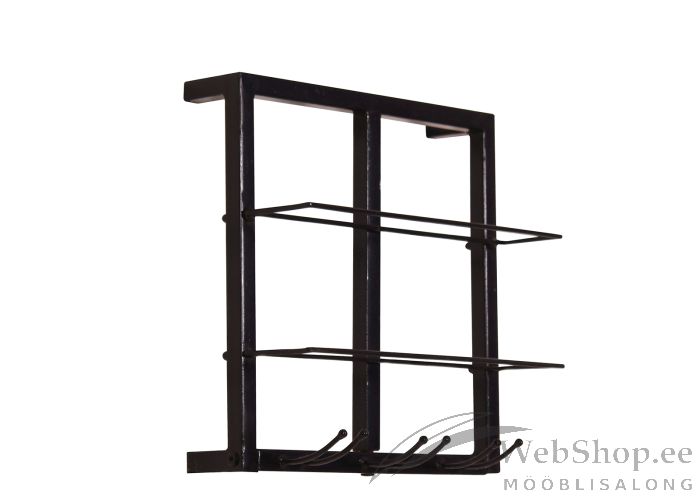 Tööstuslikus stiilis dekoratiivne veiniriiul seinale. Riiul on valmistatud 2x2 cm paksusest metallist. Viimistletud värviga. Riiulisse mahub kaks pudelit ning kolm pokaali. Kombineeri sama sarja toodetega, et luua efektne riiulite komplekt. Värvus: antiikmust.