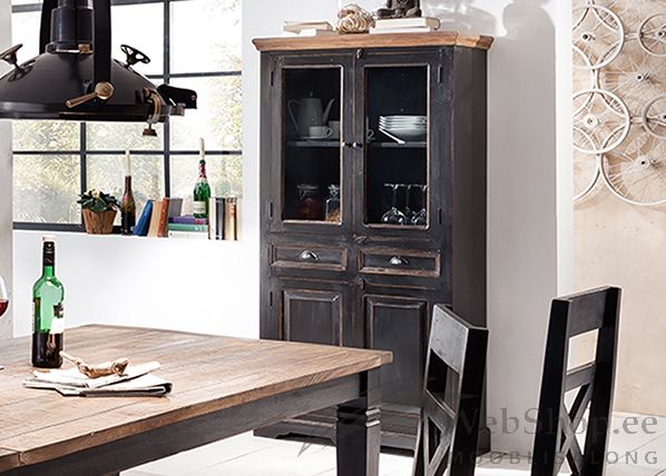 Mangopuidust ja MDF-mööbliplaadist vitriin. Küljed valmistatud MDF-mööbliplaadist. Vitriini pealmine plaat, uste ja sahtlite paneelid on mangopuidust. Kummuti pealmine plaat mee tooni. Viimistlus: must. 2 klaasist ust, 2 sahtlit, 2 puidust ust. Sahtlid liiguvad avas siinideta. Nii ülemiste kui alumiste uste taga üks riiul. Taotuslikult tehtud kulumisjäljed. Tarnitakse monteeritult.
