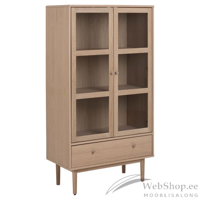 Täistammest ja tammespoonist valmistatud vitriinkapp on ideaalne valik, kui olete klassikalise Skandinaavia disaini austaja. Klaasuste taga on 2 vitriinriiulit, mis jätavad sahtli vabaks väiksemate esemete jaoks. Reguleeritavad riiulid vastavalt teie vajadustele, iga riiuli kaalumisvõime on 15kg. HOOLDUS: kõik plekid tuleb koheselt eemaldada niiske lapiga. Klaasialused ja lauamatid aitavad vältida pinnakahjustusi.