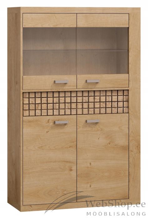 Soojas toonis naturaalse puidu viimistlusega vitriinkapp on valmistatud kvaliteetsest lamineeritud mööbliplaadist , millele lisavad ilmet stiilsed metallist käepidemed ja männipuidust sahtlipaneel