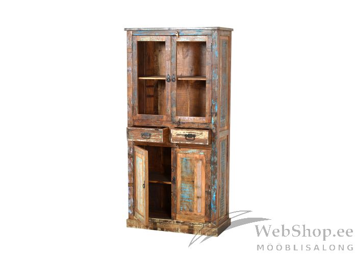 Taaskasutatud puidust vitriin. Viimistlus: mitmevärviline. 2 sahtlit, 4 ust. Sahtlid liiguvad avas siinideta. Nii alumiste kui ülemiste uste taga 1 riiul. toode on käsitsi valmistatud ning isikupärastab iga kodu.
