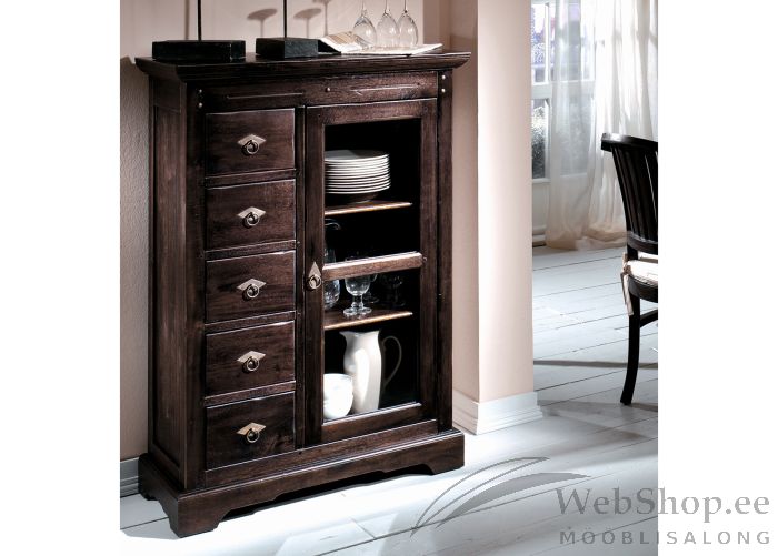 Akaatsiapuidus valmistatud vitriinkapp. Viimistlus: antiik. 1 klaasist uks, 5 sahtlit. Sahtlid liiguvad avas siinideta. Ukse taga 2 riiulit.