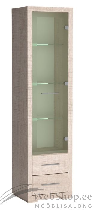 Vastupidavast melamiinkattega laminaadist valmistatud kõrge vitriinkapi allosas on 2 sahtlit ja üleval karastatud klaasist ukse ja riiulitega vitriiniosad. Sahtlitel ja uksel on stiilsed metallist käepidemed.