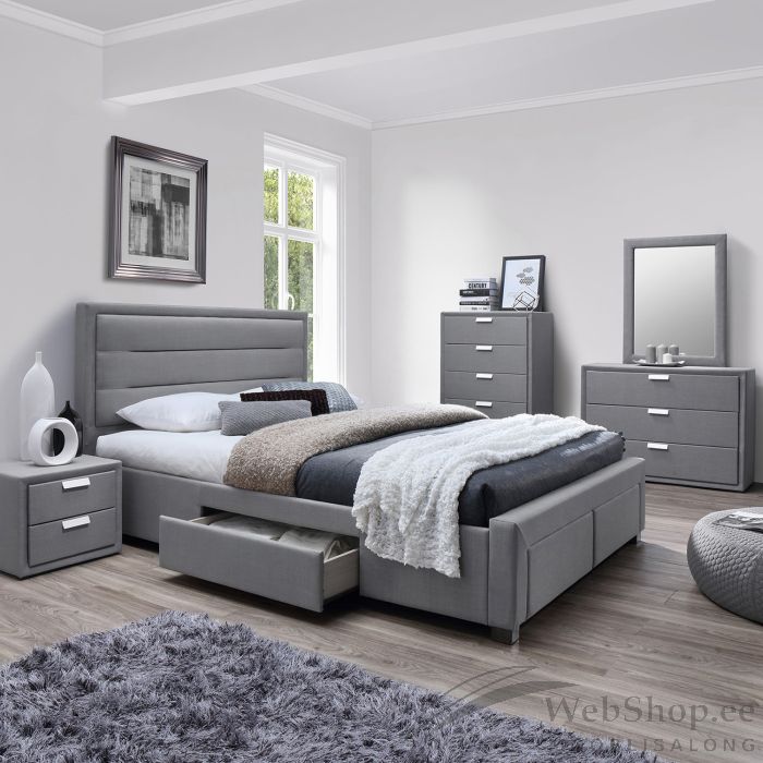 Voodi CAREN 160x200cm, hall. Voodi raami sees asuvad ruumikad panipaigad. Sahtlitesse saab mugavalt mahutada nii tekid, padjad kui muu vajaliku. Alusraami sees on neli sahtlit: üks kummalgi küljel ja kaks jalutsis. Sahtlid liiguvad metallsiinidel. Voodi korpus on valmistatud MDF plaadist ja kaetud halli polüesterkangaga. Komplekt sisaldab voodijalgu, peatsit ja põhjalippe. Madrats ei kuulu komplekti. Sobiva madratsi mõõdud on 160x200cm. Toote mõõdud on 165x220,5xH110cm.