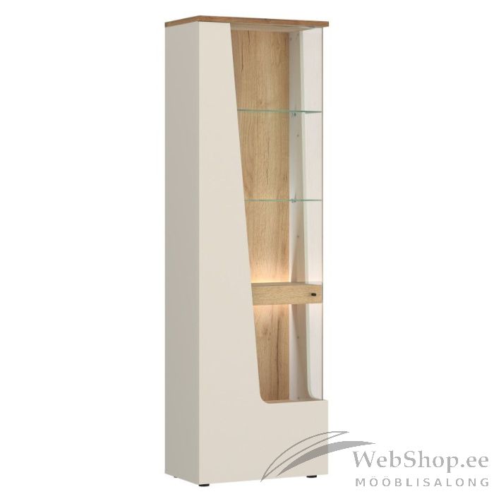 Kogu sarja mööbel on valmistatud melamiinkattega mööbliplaadist. Kaks klaasriiulit ja kaks dekoratiivset riiulit pakuvad piisavalt ruumi teie lemmikaksessuaaride esitlemiseks. Elegantselt kujundatud esipaneel kaldus klaaselemendiga püüab pilku ja lisab mööblile isikupära. Uksel soft-close süsteem. Ukse hinged asuvad vasakul, uks avaneb paremale. Komplekt sisaldab Gama LED-valgustust (1 komplekt), neutraalne valge. Klambritega LED-valgustus (LED Clips) saab osta eraldi juurde.