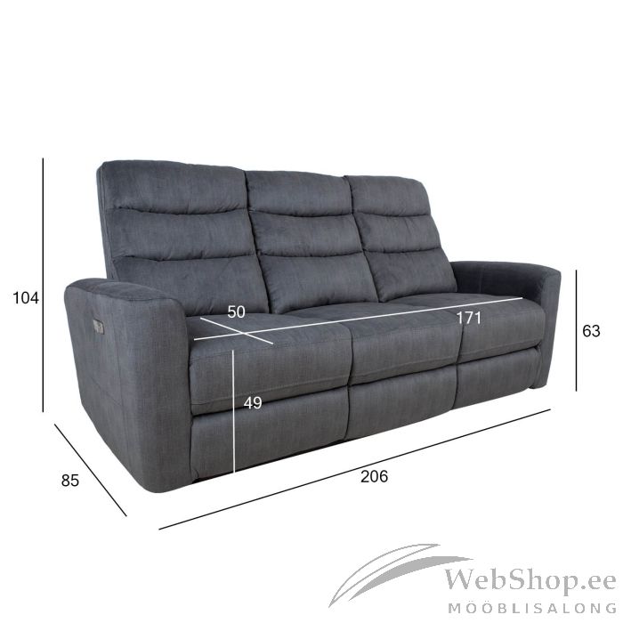 Diivan GASTON 3-kohaline elektriline recliner 206x85xH104cm, hall samet. Recliner tüüpi diivani jalatoe asendit on võimalik muuta elektrilise mehhanismi abil. Jalatuge üles tõstes liigub seljatugi sujuvalt kaasa. Keskmine iste ei ole reguleeritav. Kattematerjal: 100% polüesterkangas. Karkass ja vedrustus: puit, vineer ja metall. Pocket vedrud. Polsterdus: polüuretaanvaht 20-28kg/m³. Diivani üldmõõdud on 206x85xH104cm. Istme laius 171cm, istme sügavus 50cm, istme kõrgus 49cm. Seljatoe kõrgus 66cm. Käetoe kõrgus maast 63cm. Diivani tagakülg on viimistletud ja see on ruumi keskele paigutatav.