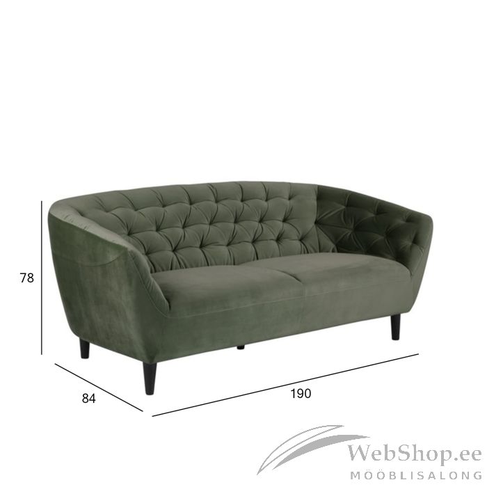 Diivani muudavad stiilseks sametine polster ja detailid. Metsaroheline sametkangas on iseloomuliku pehme tunnetusega ja lisab diivanile sügavust. Diivanil on pocket-vedrud, mis tagavad suurepärase istumismugavuse. Jalad on kummipuidust, musta värvi. Toote mõõdud on 84x191xH78cm.
