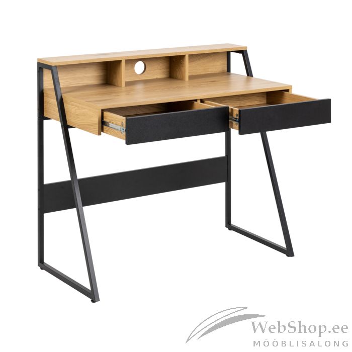 Kirjutuslaud REECE, 100x50xH88cm, 2 sahtliga. Kirjutuslaud on vajalik täiendus igas kodus, võimaldades mugavamalt arvutit kasutada või endale praktiline kodukontori ruum luua. Kirjutuslaud on valmistatud vastupidavast MDF-ist, mis on kaetud tamme melamiiniga. Kõrgendatud tagumine lauaäär aitab hoida asju oma kohal. Jalad on valmistatud musta värvi metallist. Toote mõõdud on 100x5 xH72/88cm.