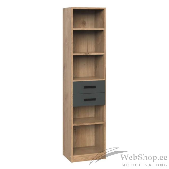Raamaturiiul on valmistatud vastupidavast mööbliplaadist ning viimistletud tammeplangu imitatsiooniga. Riiulil on kaks sahtlit ning need on viimisteltud grafiithalli tooniga. Raamaturiiulil on kolm vaheriiulit mugavaks asjade hoiustamiseks.