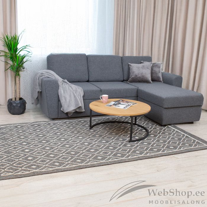 Nurgadiivanvoodi INGMAR hall. Ajatu disainiga lihtne diivanvoodi ei pruugi olla esmapilgul ruumi peategelane, kuid kujuneb kiiresti kogu pere lemmikuks tänu mugavusele ja funktsionaalsusele. Diivani karkass on valmistatud kasevineerist ja täispuidust. Istumismugavuse tagab sik-sak vedrustus ja vastupidavast poroloonist polsterdus. Lahtised seljatoepadjad on täidetud purustatud porolooniga. Seljatoepatjade katted on eemaldatavad ja pestavad. Diivan on üleni kaetud kvaliteetse mööblikangaga, Martindale'i väärtus 90 000 - 100 000. Diivani nurgaosa all on mahukas pesukast. Diivan on lahtikäiv ning vajadusel saab seda kasutada voodina. Avamiseks tõmmake istme alla paigutatud pikendusosa ette välja ja tõstke istmega samale tasapinnale. Diivanvoodi on mõeldud kasutamiseks pigem külalisvoodina, kui igapäevase magamisasemena. Kasutage alati kattemadratsit. Diivani nurk on universaalne ja selle saab tõsta vasakule või paremale. Diivani üldmõõdud on 242x168/92xH92cm. Diivani kõrgus raami ääreni 73cm. Istme kõrgus 45cm. Istme sügavus 58cm. Seljatoepadja mõõdud on 64x48x18cm. Magamisosa mõõdud avatuna 147x196cm. Diivani jalad on mustast plastikust. Diivan on toodetud Eestis.