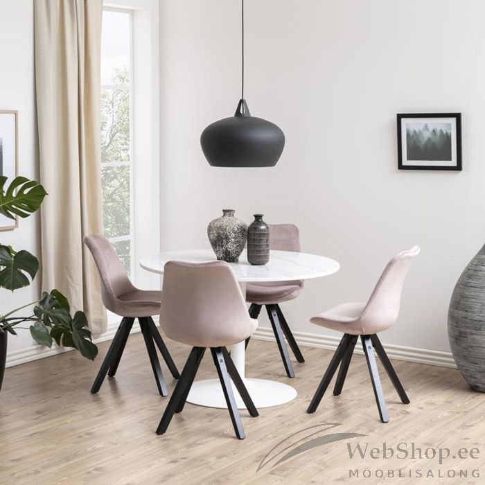 Tool ERIS 48,5x54xH85,5cm. Ajatu söögitool. Iste on polsterdatud pehme kangaga. Orgaaniline kuju sobib mugavalt selja loomuliku kumerusega, aidates säilitada hea kehahoiaku. Istet toetavad pulbervärvitud metalljalad. Iste ja seljatugi: kangas, värvus: vanaroosa, jalad: must metall. Kaalupiirang: 110kg.