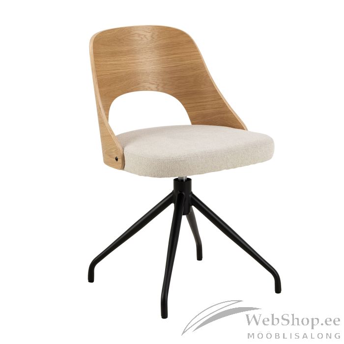 Söögitool ühendab moodsa ilme klassikalise Skandinaavia esteetikaga. Toolil on lakitud tammespoonist ümar seljatugi ja beež istmepadi. Musta värvi alusel on pöördefunktsioon, mis võimaldab mugavalt asendit muuta. Kangas: 100% polüester, Martindale > 40 000. Jalad: pulbervärvitud teras. Toote mõõdud on 48x53xH79cm.