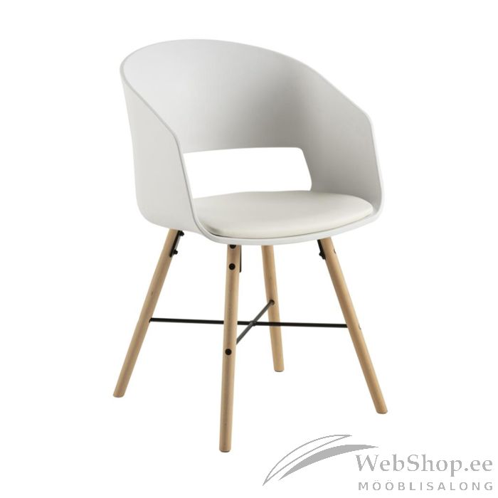 Söögitoolil on toetav seljatugi, käetoed ja pehme polsterdatud iste, mis tagavad tõeliselt mugava istumise. Avatud seljatugi täiendab disaini. Samuti suurendavad ristatud metalltorud tooli visuaalset huvi, hoides seda samal ajal stabiilsena. Tool on valmistatud plastikust. Istet katab kunstnahk. Jalad on valmistatud lakitud pöögist. Kaalupiirang on 110kg. Mõõdud on 51,5x52xH80,5cm.