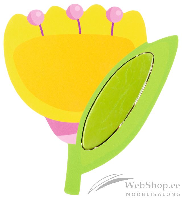 Tulbi leht on kaetud sileda PVC kangaga. # lakitud vineer (värvid: kollane, roheline, roosa) # mõõtmed 18 x 16,5 cm